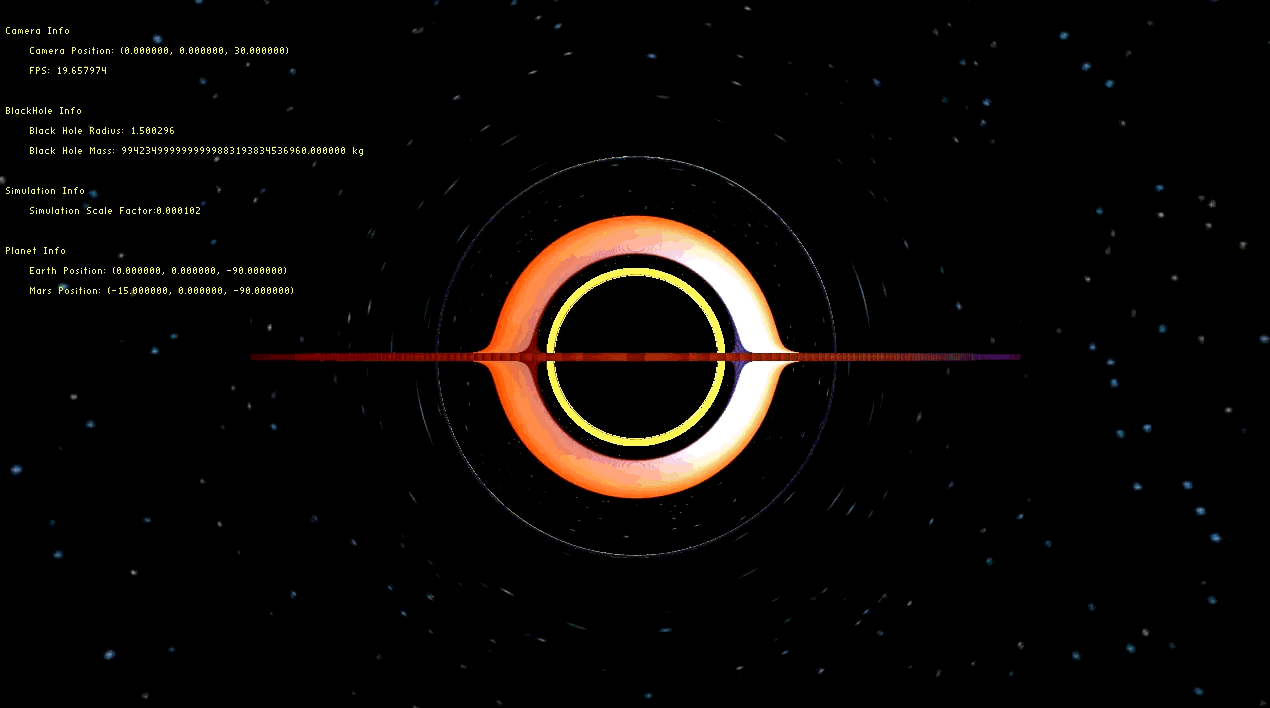 Key Features• Realistic rendering of black hole and accretion disk using compute shaders • Physically based calculation of Schwarzschild radius and orbital mechanics • Gravitational Lensing Effects on objects and backgrounds in the world space • Interactive camera controls for immersive exploration • Bloom effects and high-quality textures for planets and skybox • Toggleable debug overlays and grid for enhanced understanding | ![]() |